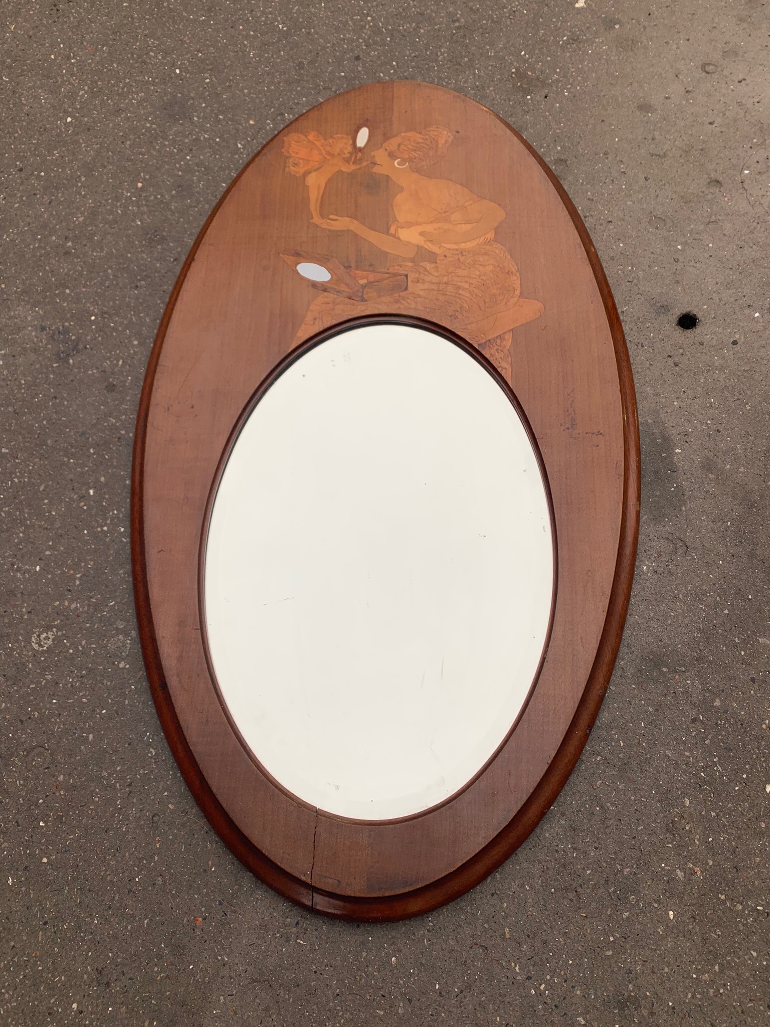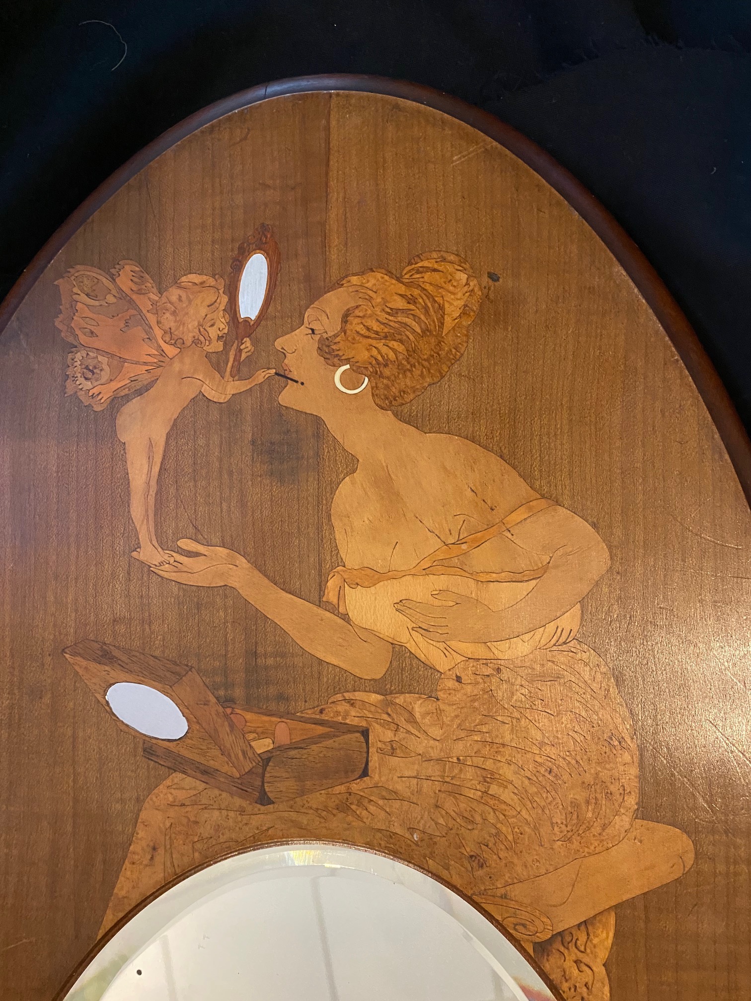 Miroir art nouveauMiroir oval à décor d'une élégante se faisant maquiller par une fée, en bois marqueté et glace biseautée, art nouveau 1900-1910