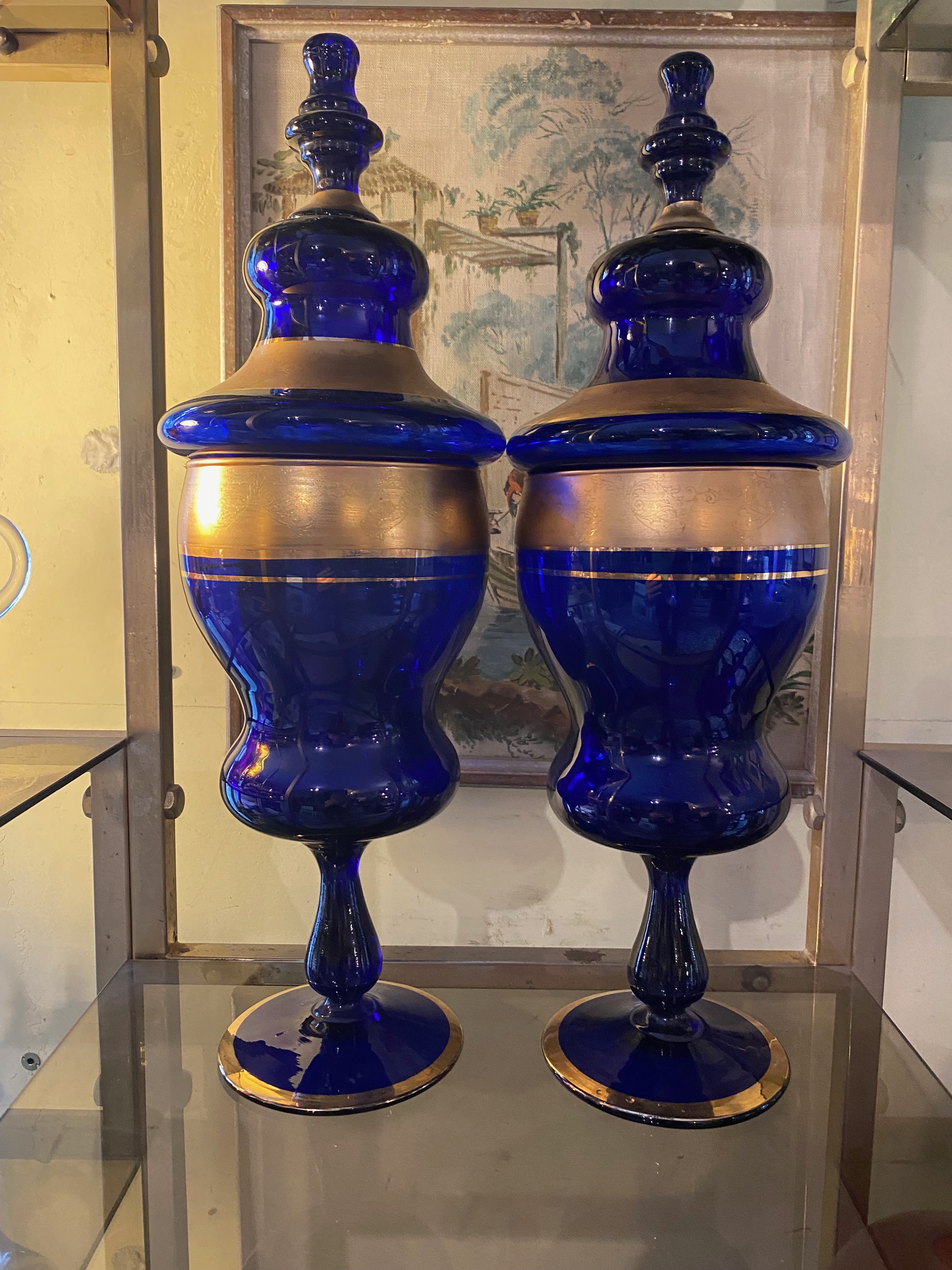 Paire de pots couvertsPaire de pots couverts en verre soufflé bleu cobalt avec décor or, début XXè siècle