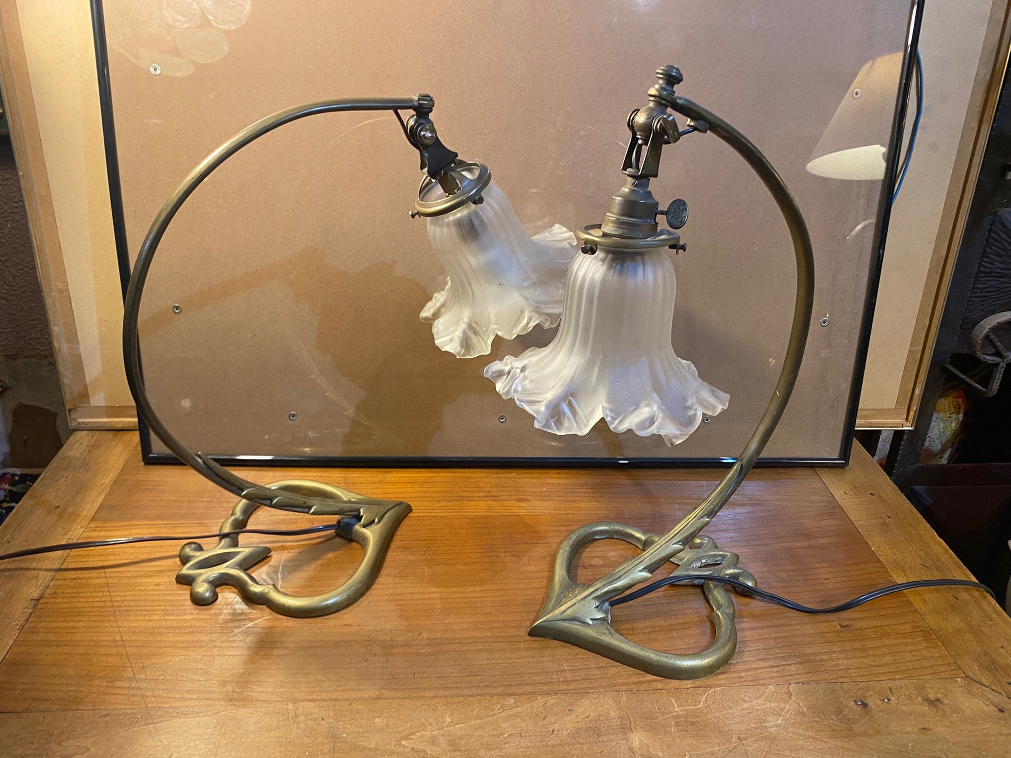 Paire lampes Art NouveauDelafontaine Auguste, paire de lampes Art Nouveau, pied en bronze, tulipe en verre, marqué en creux sous la base AD6890