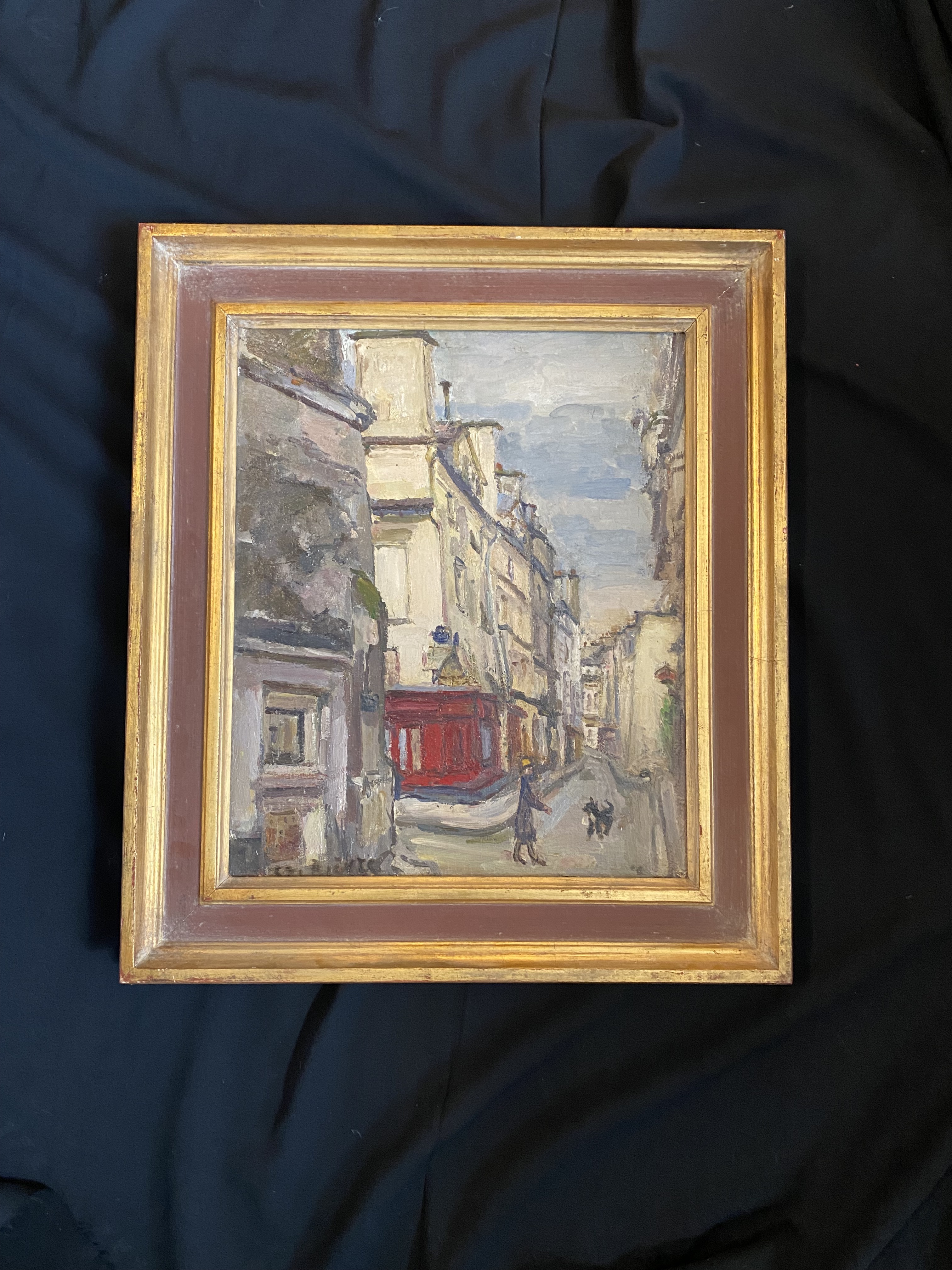 Passant et son chien à MontmartreEcole française XXe, Passant et son chien à Montmartre, Huile sur toile signée en bas à gauche