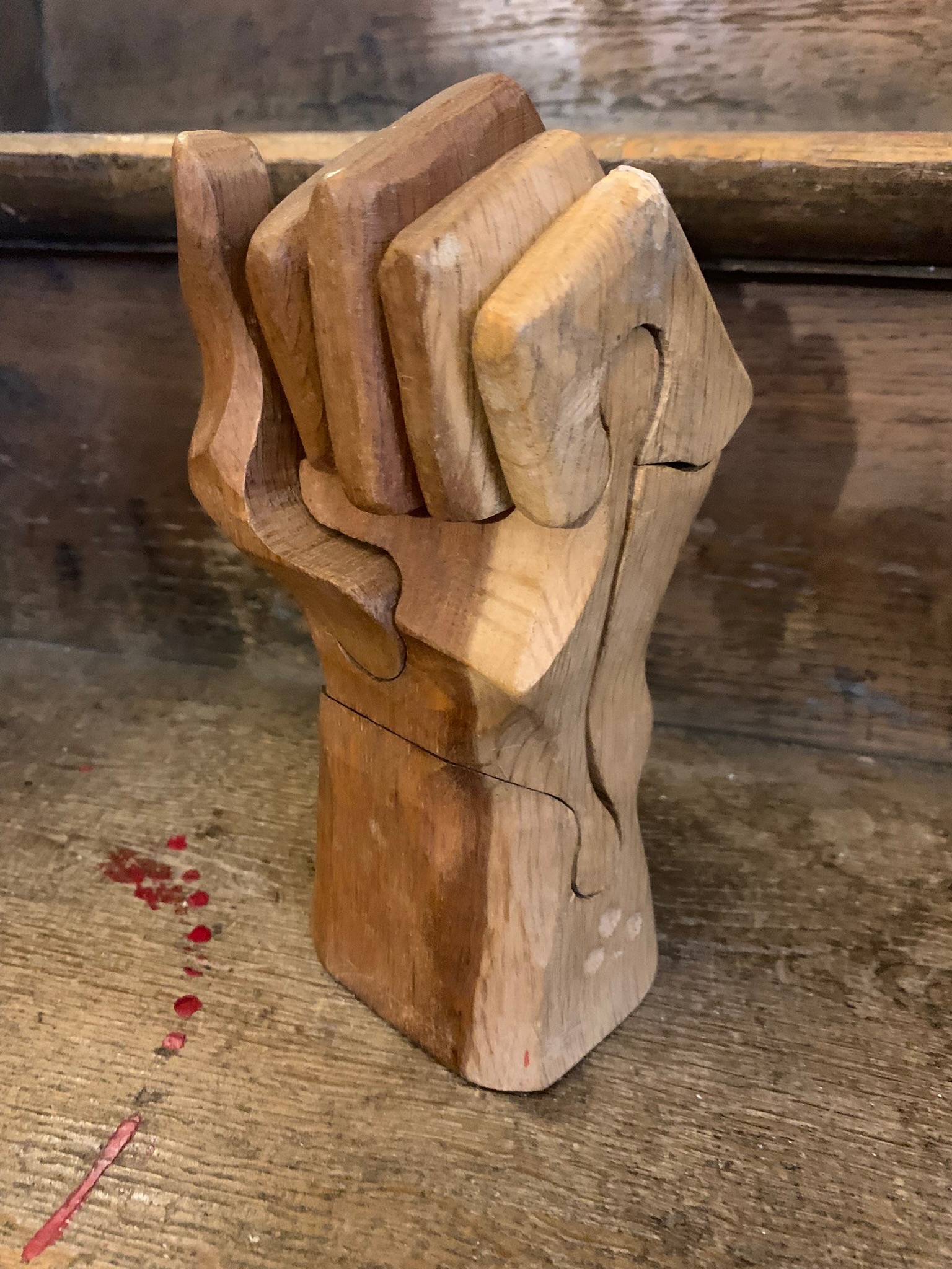 Sculpture en boisLouis de Verdal (né en 1948), Poing levé, sculpture en bois, puzzle