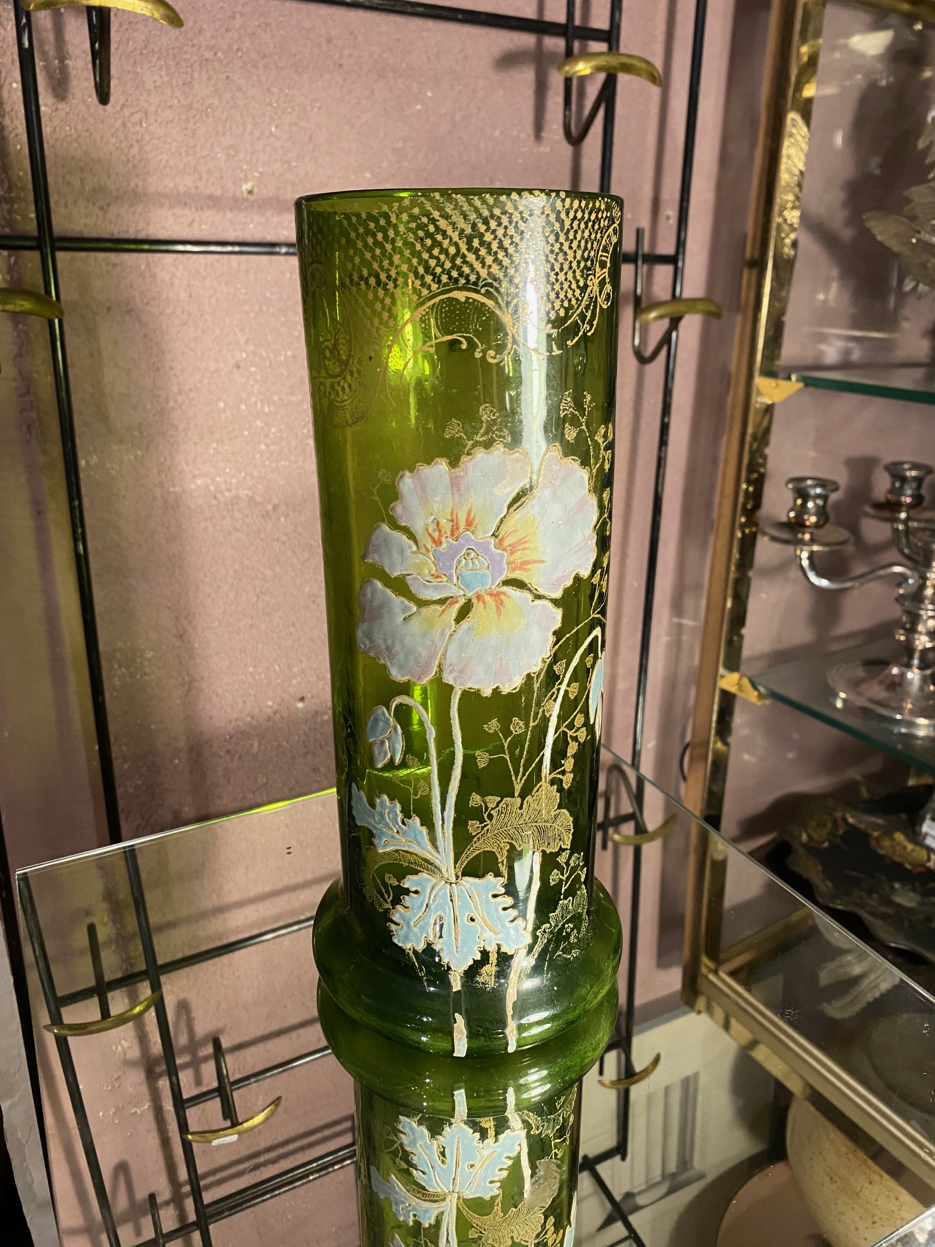 Vase émaillé LegrasVase tube à base renflée, à fond vert teinté dans la masse, décor émaillé de pavots et motifs en rehauts d'or au col. Legras non signé. catalogue p184 n4
